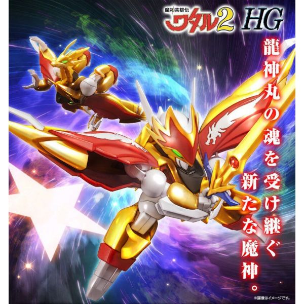 Mashin Ryuseimaru from Mashin Hero Wataru 2 joins the HG series as a kit that adopts newly designed parts. The transition into its iconic Flying Dragon Form can be recreated by rearranging certain parts. Its wide range of articulation allows it to wield the Koryuken with both hands despite its bulky design. The included Jewel stickers have been used for the gem on the Koryuken. A display base is included to display the kit in its Flying Dragon Form.